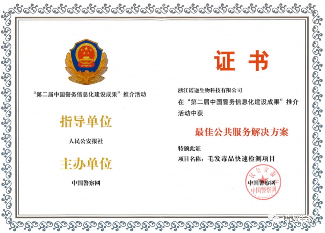 2019年5月10日,第二屆中國警務(wù)信息化建設(shè)成果推介活動研討會在北京召開,本次研討會以“新時代 新動能 新警務(wù)”為主題,由人民公安報社指導(dǎo)、中國警察網(wǎng)主辦,諾迦生物自主研發(fā)的毛發(fā)毒品快速檢測項目獲“最佳公共服務(wù)解決方案”稱號。