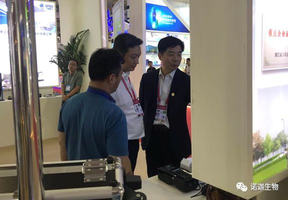 杭州市副市長(zhǎng)胡偉(中)、杭州市投資促進(jìn)局局長(zhǎng)王翀(右)蒞臨諾迦生物展臺(tái)